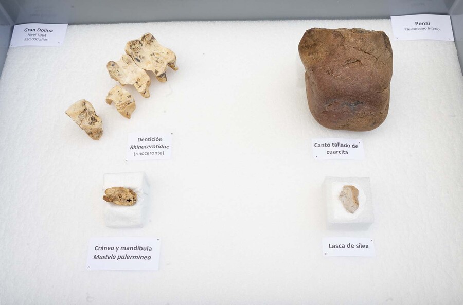 Durante la campaña de 2023, en el nivel TD4 de la Gran Dolina, se ha recuperado una gran variedad de restos de fauna, entre los que destacan los animales de gran talla tan característicos en este nivel. Los grandes protagonistas de este yacimiento, con una antigüedad aproximada de 900.000 años, son los rinocerontes, caballos, bisontes, ciervos y osos. Los restos presentan un amplio rango de edad de muerte, encontrando desde vértebras de neonatos de oso hasta los dientes de un viejo rinoceronte cuyo enorme desgaste le habría dificultado severamente la masticación. Los fósiles se encuentran en un magnífico estado de preservación y, algunos de ellos, se encuentran en conexión, como la columna vertebral con sus costillas o la extremidad anterior o “mano” de un rinoceronte con los huesos de la muñeca. Pero no todo son animales de gran talla. Esta campaña nos ha sorprendido con el hallazgo de un carnívoro pequeño, ancestro del lobo actual, o el cráneo y la mandíbula completos de Mustela palaerminea, uno de los mustélidos más pequeños que se conocen de esa época. Las marcas de corte encontradas en una costilla y un fragmento de sílex, ratificarían la presencia humana en la Sierra hace cerca de un millón de años.