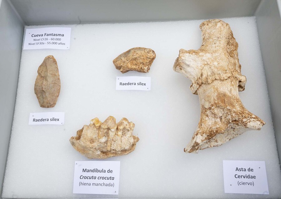 En Cueva Fantasma los trabajos de excavación de la campaña 2023 se han centrado en los sectores del yacimiento. En el sector de Cueva Fantasma se ha intervenido sobre los niveles CF26 y CF25. En CF26 se ha recuperado una importante colección de instrumentos líticos como lascas de sílex, arenisca y cuarcita, así como productos levallois (lascas laminares). En CF25 se ha localizado una acumulación de huesos de grandes dimensiones. En estos huesos aparecen marcas de actividad humana (como la fractura para la extracción de médula ósea) y hay otros que han sido regurgitados por las hienas. En este nivel se han identificado muy pocas piezas de industria lítica, pero destaca una punta levallois de arenisca.