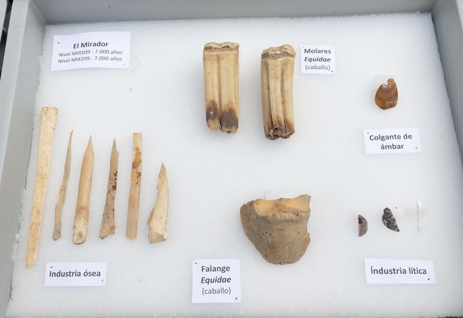 En la cueva de El Mirador se han excavado niveles del neolítico antiguo, con una antigüedad de cerca de 7.000 años, ricos en restos de cultura material, principalmente cerámica e instrumentos líticos, y en restos óseos de especies domésticas. Destacan, junto a las habituales ovejas y cabras, la abundante presencia de restos de caballo, poco comunes en este periodo, que ayudaran a completar los estudios genéticos sobre los équidos peninsulares que se están llevando a cabo en El Mirador.